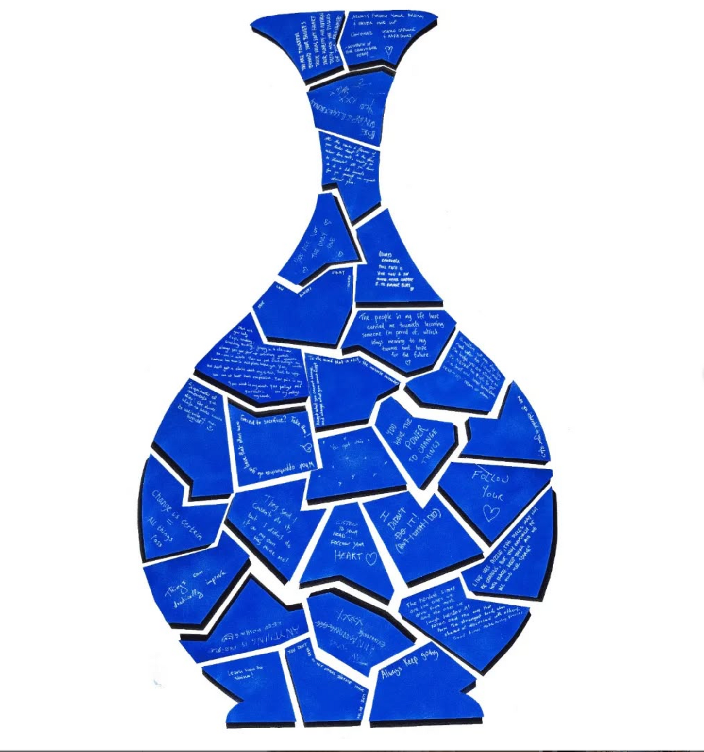Inspired by the Japanese art of Kintsugi, Rokben Ceipes invites participants to engage in symbolic healing. Inside a circular alcove of translucent fabric, paper fragments of a broken vase lie scattered across the floor. Visitors are invited to write a reflection on resilience on a piece and place it on the wall—where each shard finds its place in the outline of a large-scale vase. Together, the broken is made whole again.